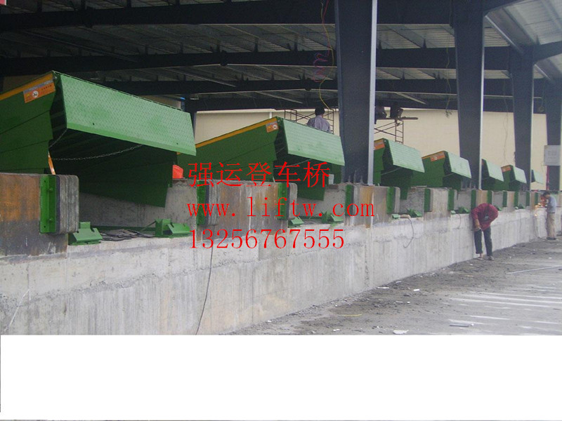 固定登車橋產(chǎn)品說明: 固定式液壓登車橋(又名:高度調(diào)節(jié)板/卸貨平臺或電動液壓月臺)是實現(xiàn)貨物快速裝卸的專用輔助設(shè)備,安裝在月臺、建筑物上,搭接于貨車車廂,調(diào)節(jié)月臺、建筑物地面與車廂之間的高度差。登車橋前端的可翻轉(zhuǎn)搭接扳在裝卸貨物時始終緊貼車廂。登車橋的角度調(diào)節(jié)功能使使貨車與建筑物地面之間架起一座橋梁,各種搬運車可順利通過登車橋,在建筑物地面與車廂間運送貨物。并且,只需一個操作工人作業(yè),即可實現(xiàn)貨物的快速裝卸。它使企業(yè)減少大量勞力,提高工作效率,獲取更大經(jīng)濟(jì)效益.是現(xiàn)代企業(yè)安全生產(chǎn),提高物料流通速度之首選。 固定式液壓登車橋的應(yīng)用:產(chǎn)品可根據(jù)用戶的不同需要,廣泛應(yīng)用于碼頭、站臺、倉庫等地。在外形尺寸,承受載荷等方面都可以作特殊設(shè)計。 固定式登車橋安裝在貨臺的側(cè)面,與貨臺地面和側(cè)面齊平。 固定式登車橋的橋板可上、下傾斜,其外端可高出或低于貨臺平面,使之與車廂等高。橋板的頂端有一翻板,自動搭在車廂邊緣,使貨臺與車廂平穩(wěn)過渡。 固定式液壓登車橋的特點: 1、電控操作只需按動按鈕,調(diào)節(jié)板會自動升起,操作極其簡單;松開按鈕,調(diào)節(jié)板靠自重下降, 活頁搭板搭在貨車上即可使用。 2、通過動力系統(tǒng),大油缸升起整個斜板,至頂位時,小油缸開始工作,順暢伸出活頁搭板, 高度調(diào)節(jié)板全部采用濟(jì)南濟(jì)鋼優(yōu)質(zhì)高度花紋鋼板及型材緊密焊接,壽命長久。 3、液壓系統(tǒng)采用意大利原裝進(jìn)口的優(yōu)質(zhì)品牌產(chǎn)品,性能卓越,極少維修。 4、獨特的"流線型"開放式活頁關(guān)節(jié)設(shè)計,比其它傳統(tǒng)的管式關(guān)節(jié)增加焊接面積達(dá)3倍以上,大大延長使用壽命,且方便維護(hù)。 5、調(diào)節(jié)板兩側(cè)分別有3塊活動板,可有效避免調(diào)節(jié)板下降時壓傷腳趾的危險,以確保安全。固定式登車橋調(diào)節(jié)板底座前面為開放式設(shè)計,清理雜物方便快捷。 6、獨特設(shè)計的"工"字鋼骨架能平均承托壓力,且減少骨架的扭力,比其他槽鋼結(jié)構(gòu)更堅固 耐用。 7、在維護(hù)、保養(yǎng)和清潔時,用撐桿支撐起調(diào)節(jié)板,更加安全可靠。 固定登車橋產(chǎn)品參數(shù): 型號起升高度(米)載重負(fù)荷(公斤)配套動力(kw)臺面尺寸(長*寬mm)外形尺寸(長*寬*高)mm 單機重量(公斤) DCQG6-0.6 +400\ -200 6000 0.75 2500*2000 2500*2000*700 700 DCQG8-0.6 +400\ -200 8000 0.75 2500*2000 2500*2000*700 850 DCQG10-0.6 +400\ -200 10000 0.75 2500*2000 2500*2000*700 1000 DCQG12-0.6 +400\ -200 12000 0.75 2500*2000 2500*2000*700 1150
